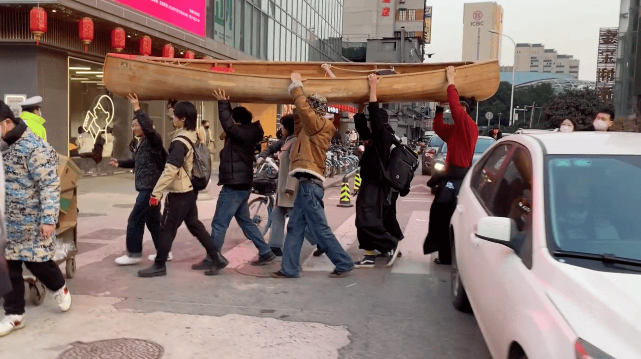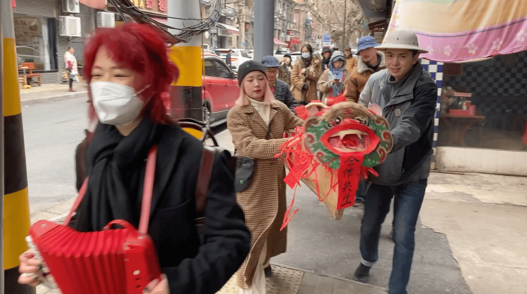 - 路上行舟(2022.2):我们过年的时候把这船从武昌运到汉口,抬着船在街道上走了一大圈。很多留在武汉过年的年轻人参加了这次上街过年;其中一位朋友这样写道:“行驶在人流汹涌的江汉路上,航道里的行人像一样的浪花被我们用船拨开,向两侧分去,而他们的目光变成了水珠落在了船和我们的身上。越往中心走,浪花越密集,溅到身上和船上的水珠也就越来越多。……我感受着江汉路,感受着浪花与周遭的一切,……我们在过自己的年……”;(可以左右滑动浏览图片)