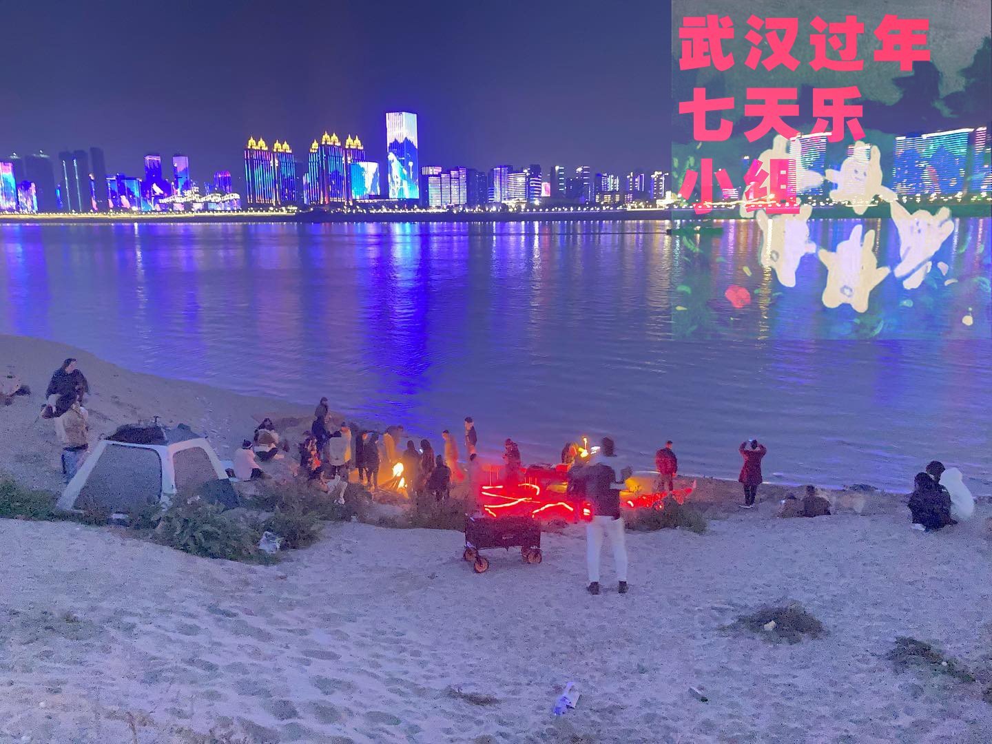 - 兔兔过江和武汉过年七天乐(2023.1):次年春节前后,我们为了延续之前的游春行动,在城里不断寻找合适的地方可以放音乐、露营、烧火和开趴,每天尝试一个地点做demo party,最终在江边办起一个大趴。趴体由龚豪发起的“兔兔过江”开始:独木舟载着两位属兔的朋友横跨长江,到达汉江和长江交汇处(南岸嘴),“此地会是我们在这个城市里放牧路线的其中一个营地,songline上的一点。”之后武汉各种年轻人也陆续在不同的公共空间如废墟、桥洞办起各种野趴;(可以左右滑动浏览图片)