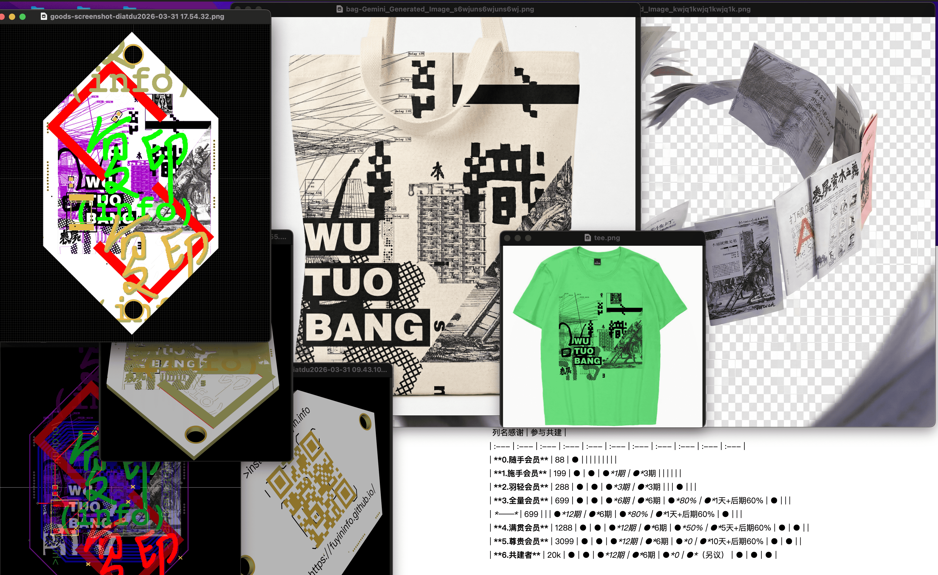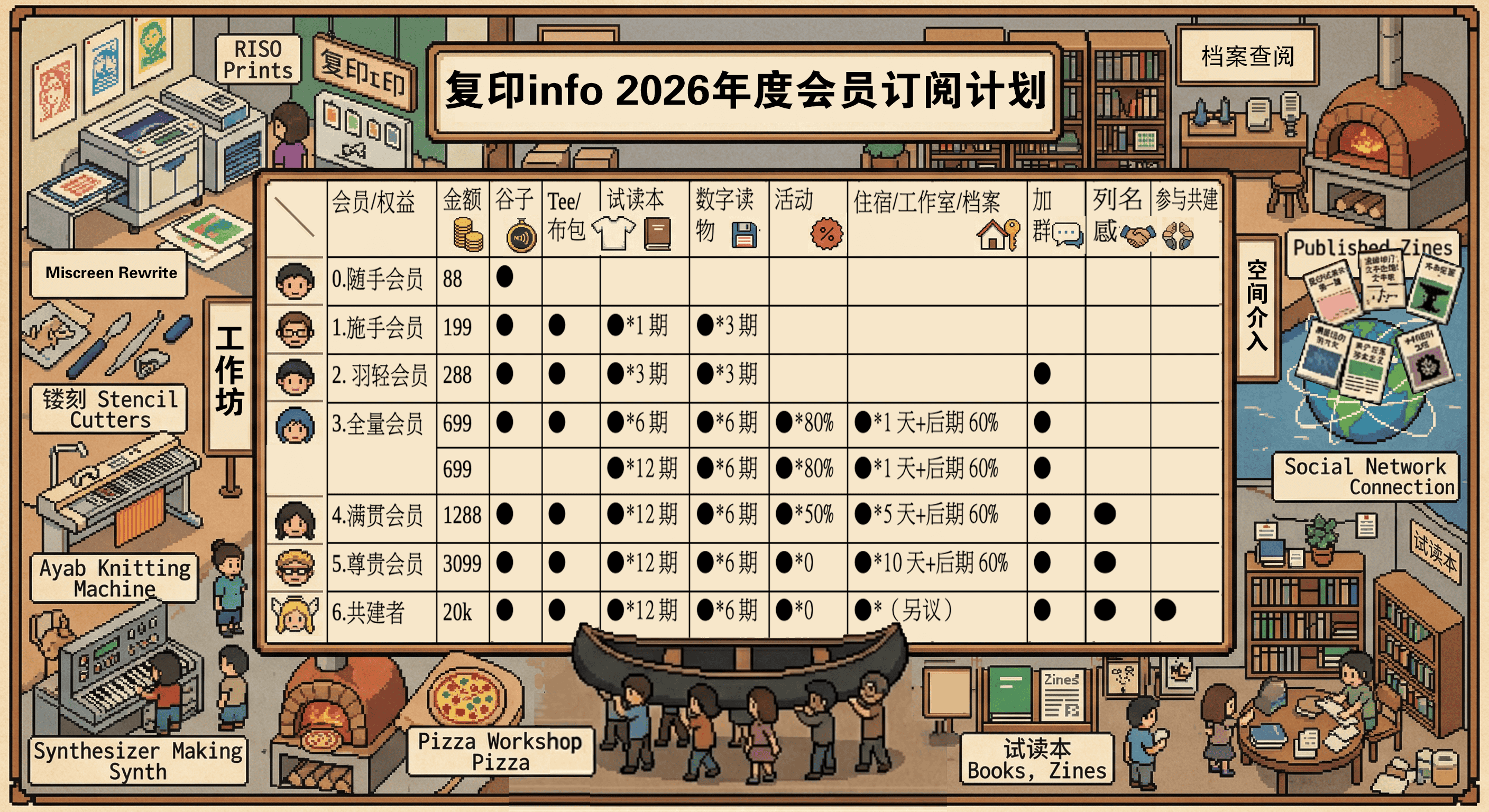 | 会员/权益 | 金额 | 谷子 | Tee/布包 | 试读本 | 数字读物 | 活动 | 住宿/工作室/档案 | 加群 | 列名感谢 | 参与共建 |