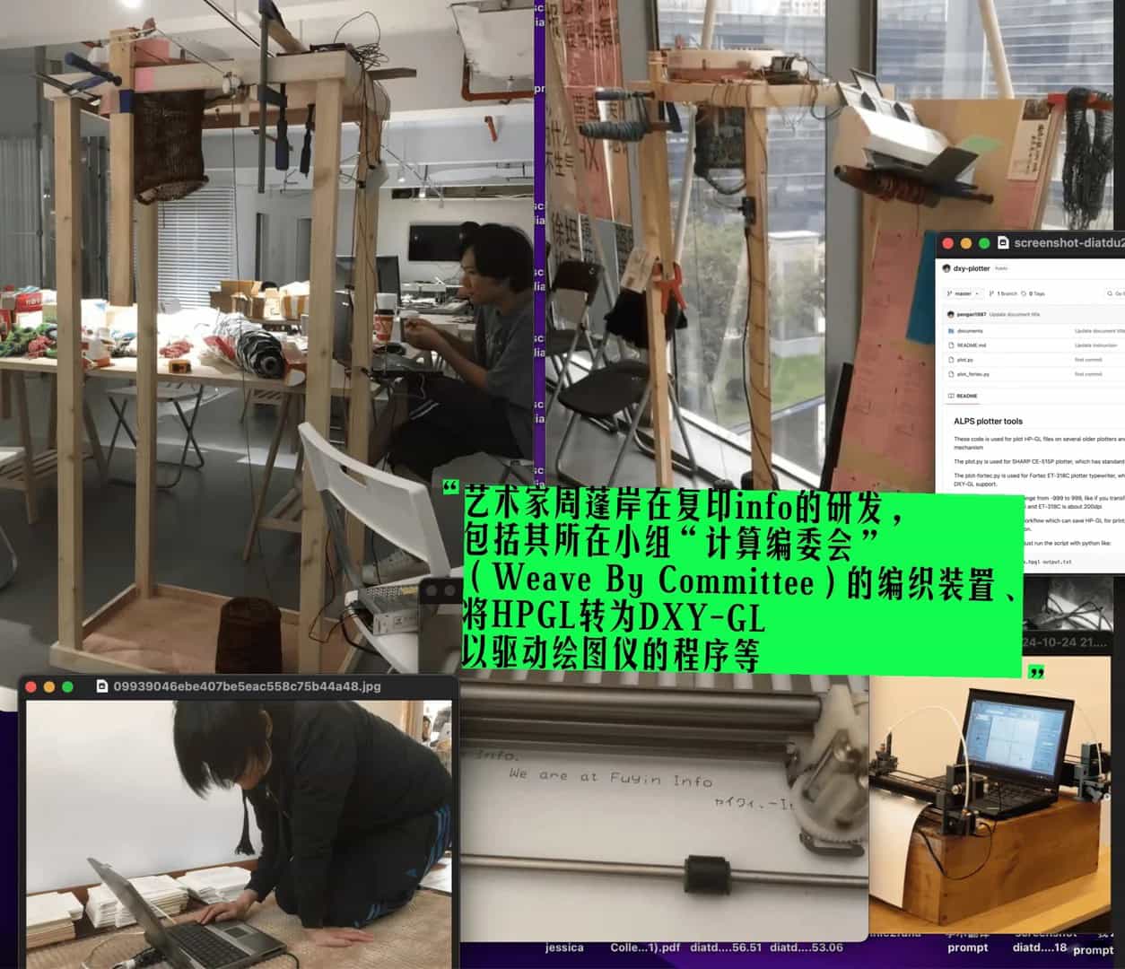 或许整理过去几年里做过的项目,特别是疫情的那几年,会让这个轮廓更加清晰、形状粗显:复印info翻译、印行了一系列关于技术与女性,计算机写作与编织、影像行动、乌托邦等相关的文章和小册子[2],并参加过包括abC艺术书展、上海UNFOLD艺术书展、孢子书会、武汉艺术书展、下榻艺术节等展会;陆续收集整理了亚欧各地与媒介、出版、开源技术、艺术等相关的各类资料档案;分享了一系列的DIY技术包括镂刻版画(stencil)、无化学制版过程的数字孔版技术的低保真重写(RISO Miscreen Lo-fi Rewrite,自研发)、Brother 编织机的ayab主板改造、合成器制作、烧薯窑/窑鸡、烤pizza等,并开了相应的工作坊[3];协办组织了第七届网络社会年会的武汉圆桌会议“在网络上如何问邻居借盐:Web3 时代的全球化技术和本地实践”[4];与本地的朋友们一起开展了很多艺术行动包括“路上行舟”[5]、众筹的造船工作坊等[6];和身处异地的朋友一起办了“云喝酒”酒局[7]、参与“各地落脚目录”[8]给流动青年提供住宿,和各地的替代性空间及年轻人们串联起来;接待过来自不同国家和地区,涉足行为艺术、戏剧/表演、摄影/影像的电影导演和艺术家、学者,期间给他们提供创作的协助和支持;也办了好些讲座、分享、放映和演出[9],和本地社会有过好些互动[10]。由此也受到了不同艺术家、策展人和学者,特别是年轻学生和文艺青年们的关注,引起过一些讨论[11]。